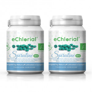 eChlorial Organic* Spirulina: 100% ren certifierad organisk* spirulina, i 400 mg (0,4 g) eller 500 mg (0,5 g) tabletter beroende på lager. Ultrarent växtplankton, odlat i Europa under kontrollerade naturliga förhållanden.
